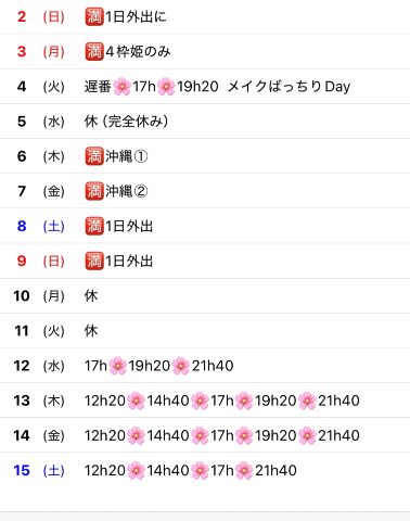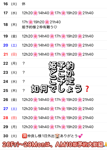 11月中旬以降終盤ですが、都合つくよっ😇て殿方🙏何卒宜しくお願い致します🙇‍♀️おそらく現状ゆったり過ごしていると思いますので、来てくれたらありがたみ満載で盛大にお迎えします😚🌸😍事前予約大変ありがたいですが💌当日駆け込みでも空いていると思うので当日派の方もこの機会にぜひ逢いに来てください🙏🥰